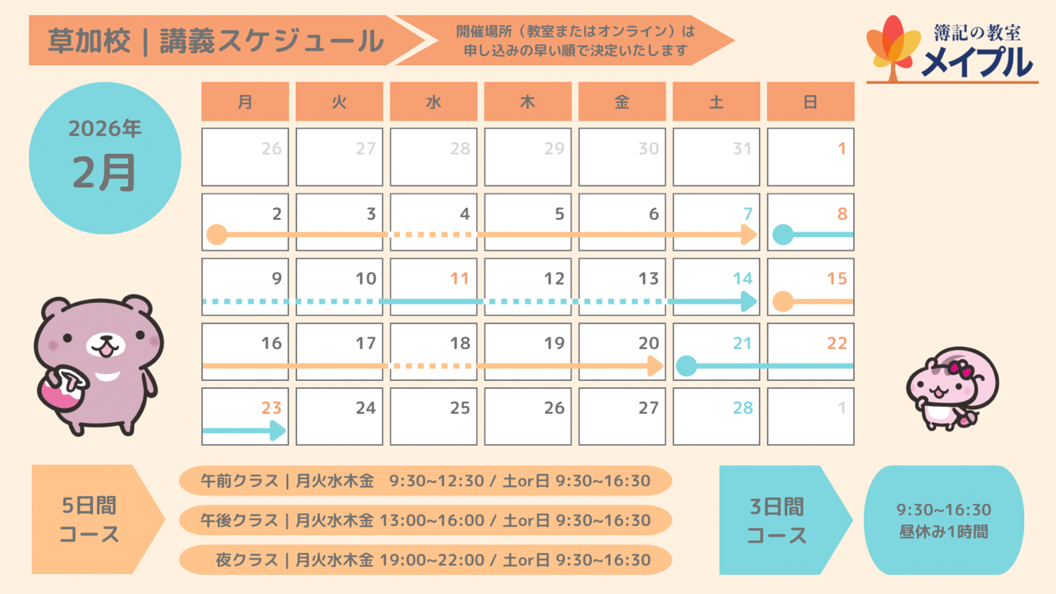※最新スケジュールについては、講座ページに移動いたしました。お電話、メール等でもお気軽にお問い合わせください。